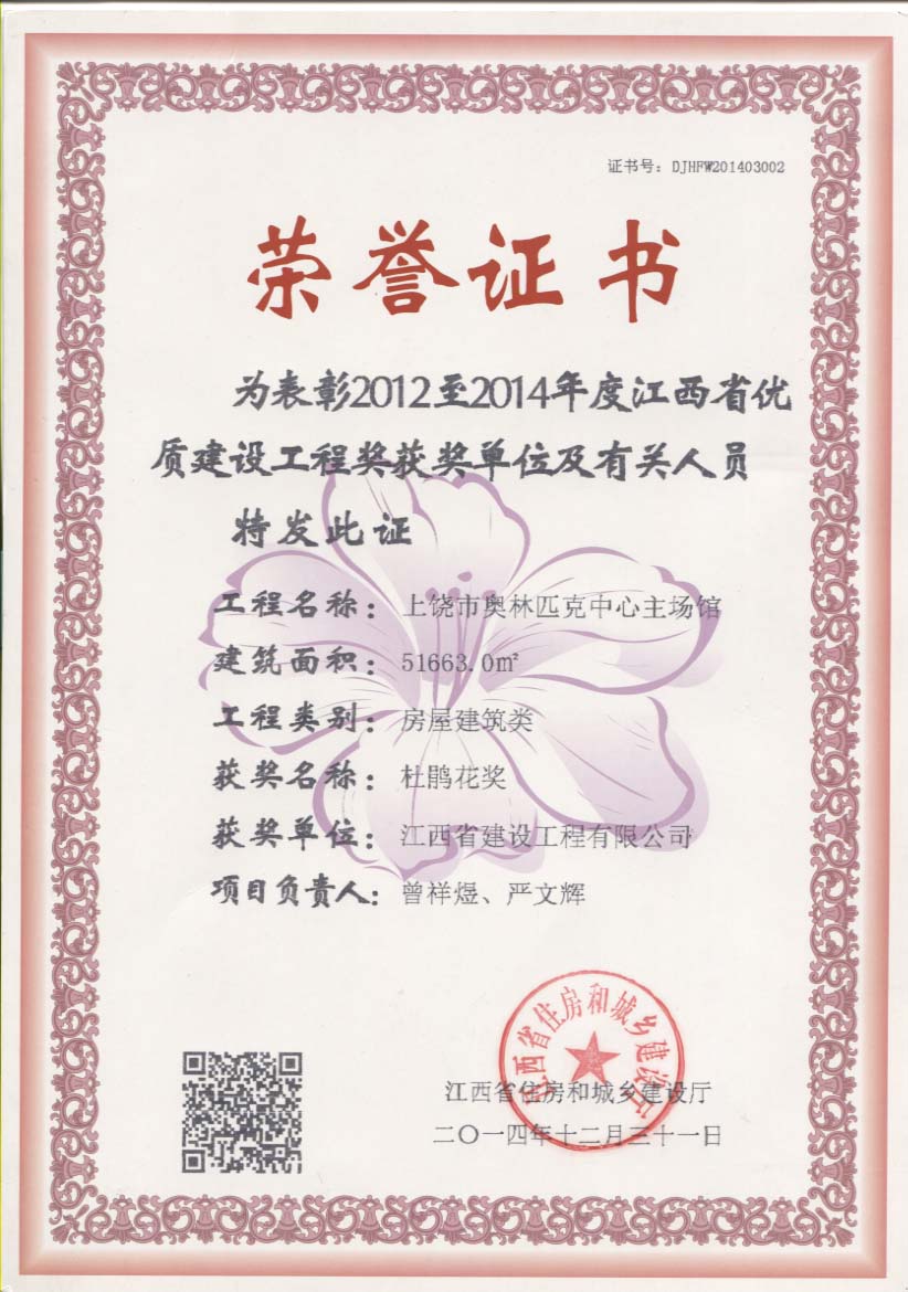 上饒奧體中心主場館項目榮獲“江西省優(yōu)質(zhì)工程杜鵑花獎”